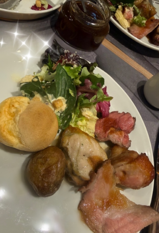 店員さんがお肉や野菜を持って定期的にまわってくるのですが食べるか食べないか聞かれ野菜以外の物は全て「YES」と答える私にお姉さん達に野菜も食べなさいと言われますが聞こえないふり?サラダだけ先に取り分けされていたのでいただきました。